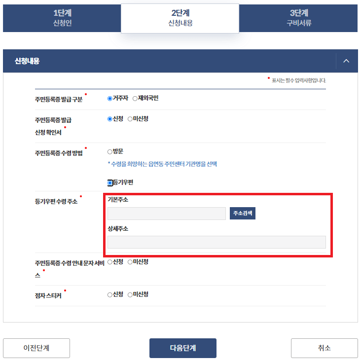 ※ 등기우편 선택 시 등기우편 수령주소를 입력하시면 됩니다.