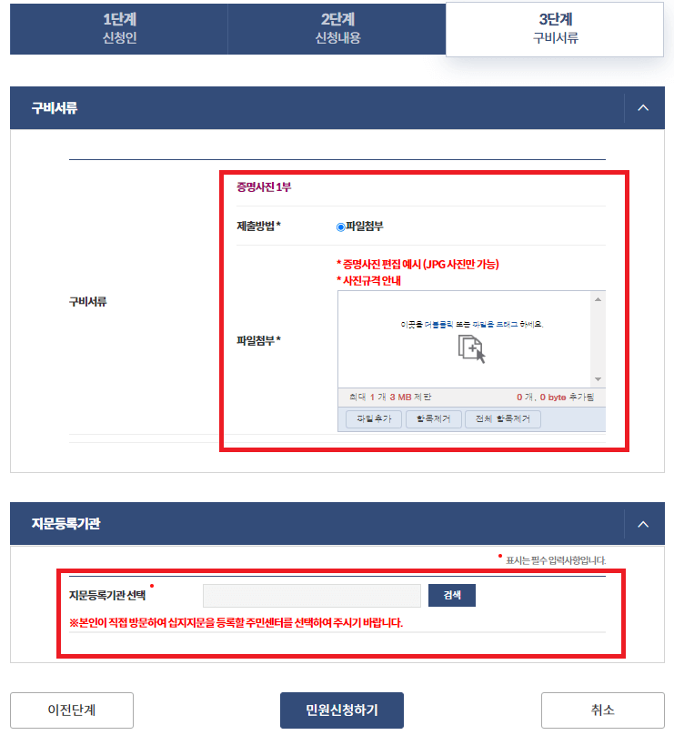 ⑥ 증명사진을 "파일추가"를 선택하여 첨부하시면 됩니다. 그리고 지문등록은 직접 방문하여 등록해야 되므로 방문가능한 기관을 조회하여 선택합니다.