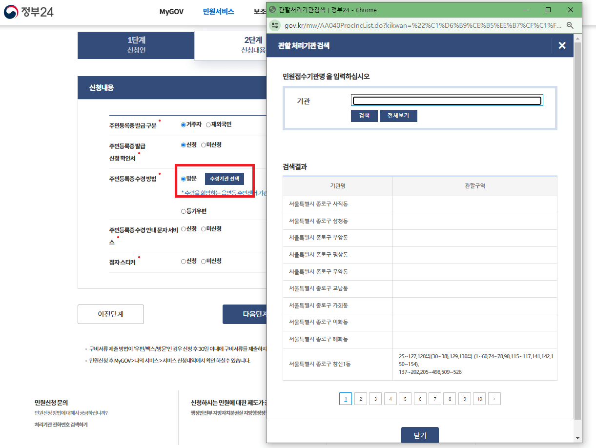 ※ 방문선택 시 방문가능한 수령기관을 선택하시면 됩니다. 거주지 외 직접 방문가능한 기관으로 선택하셔도 됩니다.